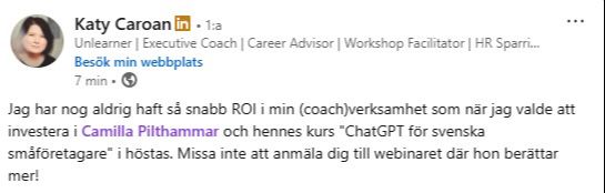 "Camilla har hjälpt mig att använda AI i mina sociala medier tex till olika foton mm. Camilla är påläst och kunnig, det hon inte vet det tar hon reda på direkt. Camilla är alltid i framkant och framåtlutad. Pedagogisk, kunnig och hjälpsam. Hon har lärt mig väldigt mycket på kort tid. Tack Camilla!"